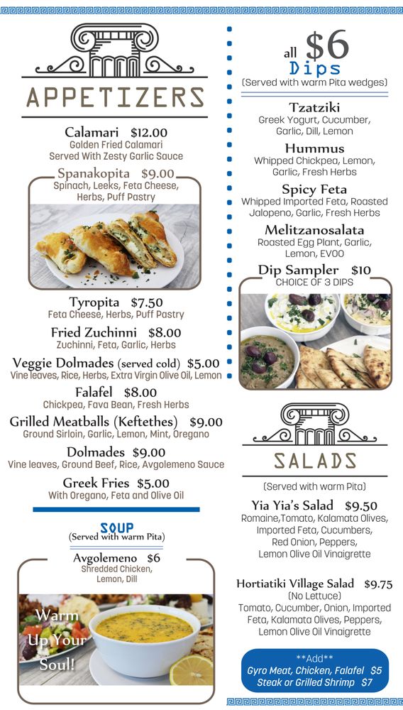 Yia Yia’s Kitchen is a Greek restaurant located in Beltsville, MD, offering a variety of delicious dishes. The menu includes appetizers such as Calamari, Dolmades, Falafel, and Grilled Meatballs, as well as a selection of dips like Tzatziki, Hummus, and Spicy Feta. The salads at Yia Yia’s Kitchen are fresh and flavorful, with options like Yia Yias Salad and Hortiatiki Village Salad. The restaurant offers amenities like delivery, takeout, reservations, and catering, making it a convenient choice for diners. With a focus on traditional Greek flavors and a cozy atmosphere, Yia Yia’s Kitchen is a great spot for a meal with friends or family. The menu is diverse and caters to a range of dietary preferences, including vegan options. Don't miss out on the chance to try their authentic Greek cuisine!